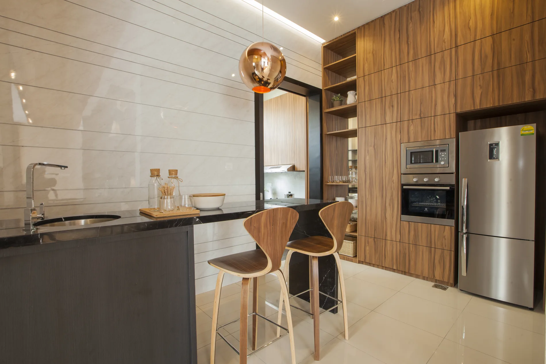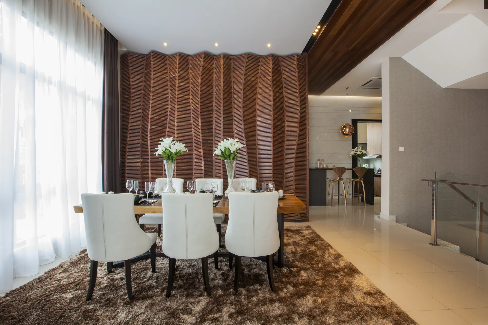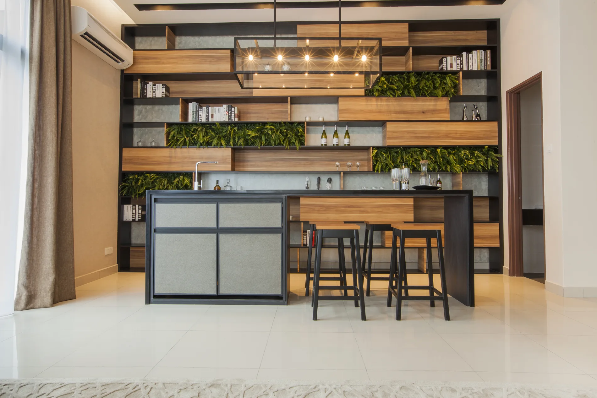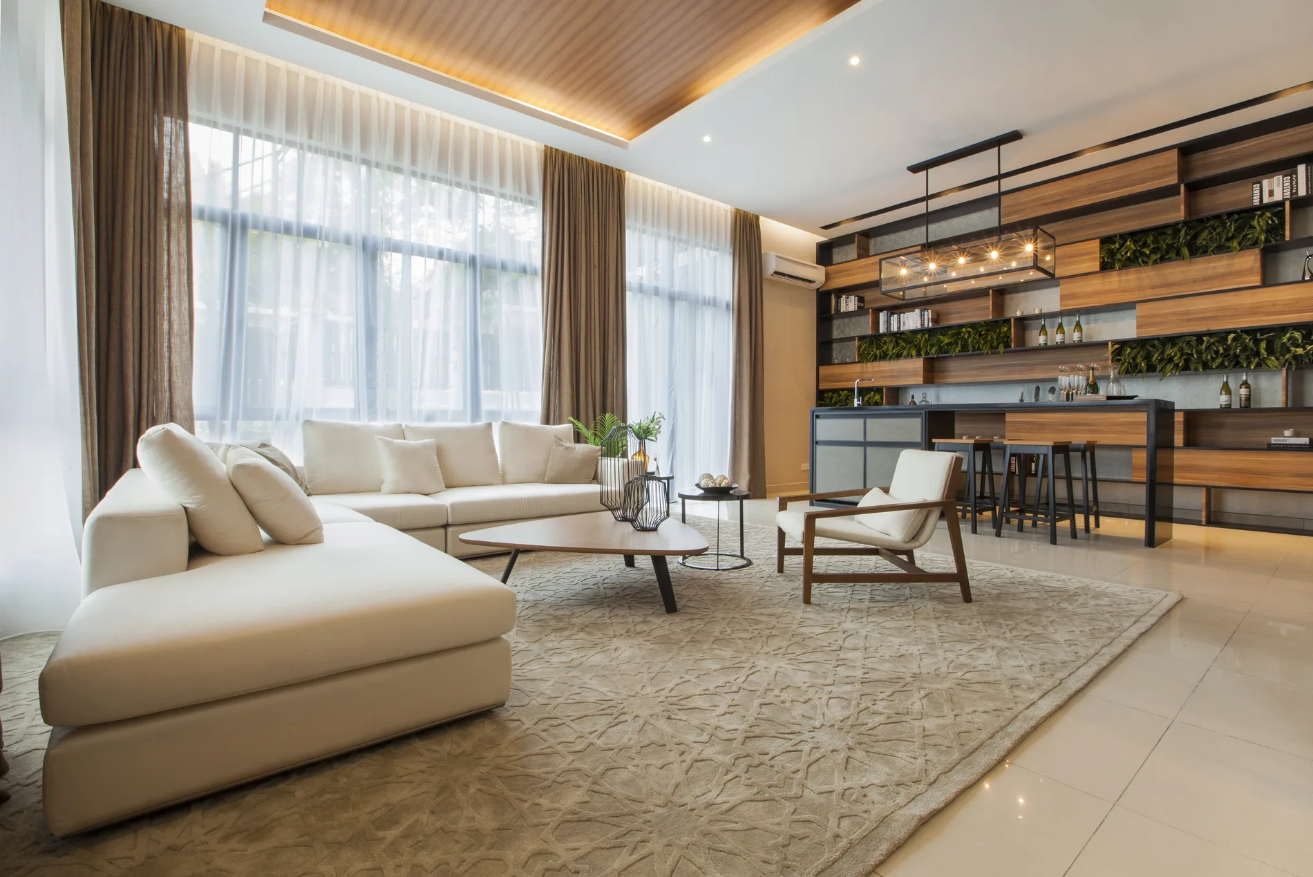 This triple-storey semi-detached home blends modern tropical design with natural materials and minimalist elements. The foyer features a high ceiling, L-shaped sofa, timber ceiling, and a wood-and-steel bar counter. The open-concept living and dining area is complemented by a shag rug and organic wall feature, while the dry kitchen boasts marble-like walls and Black Marquina marble counters.