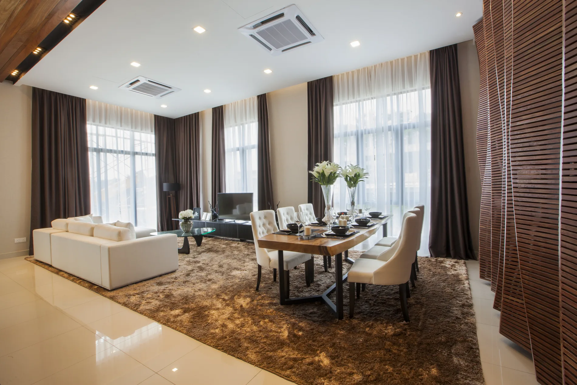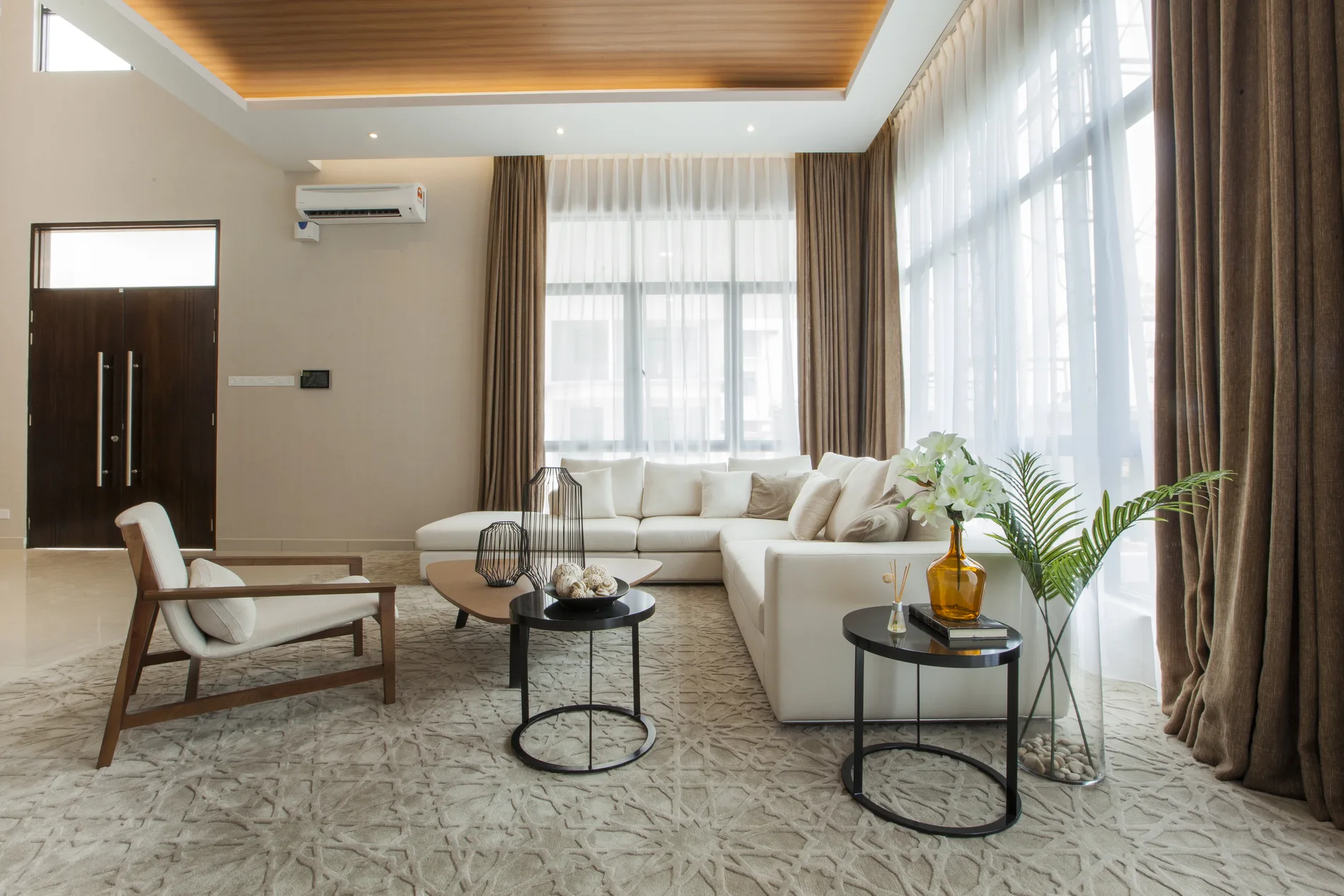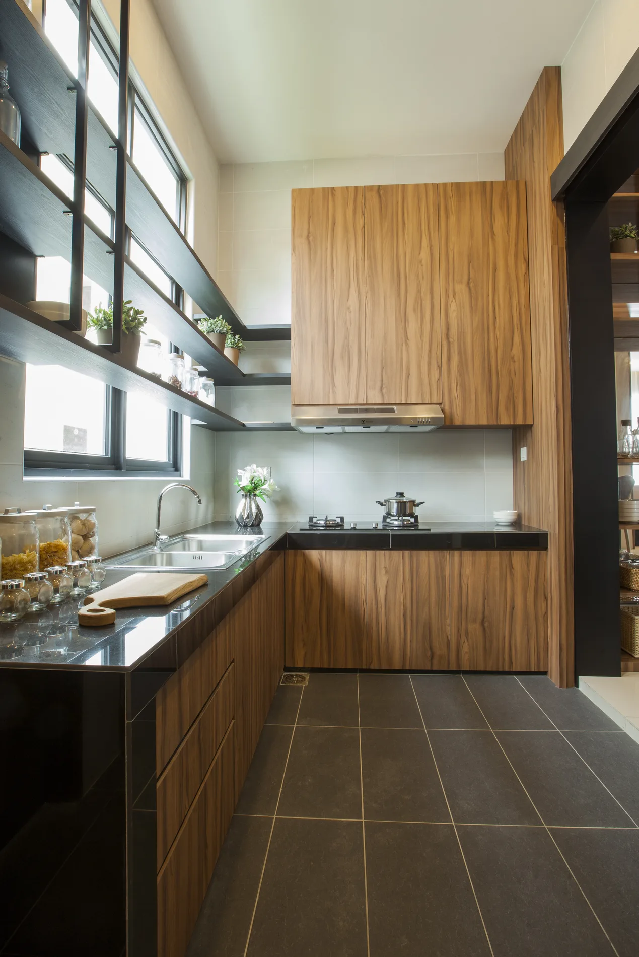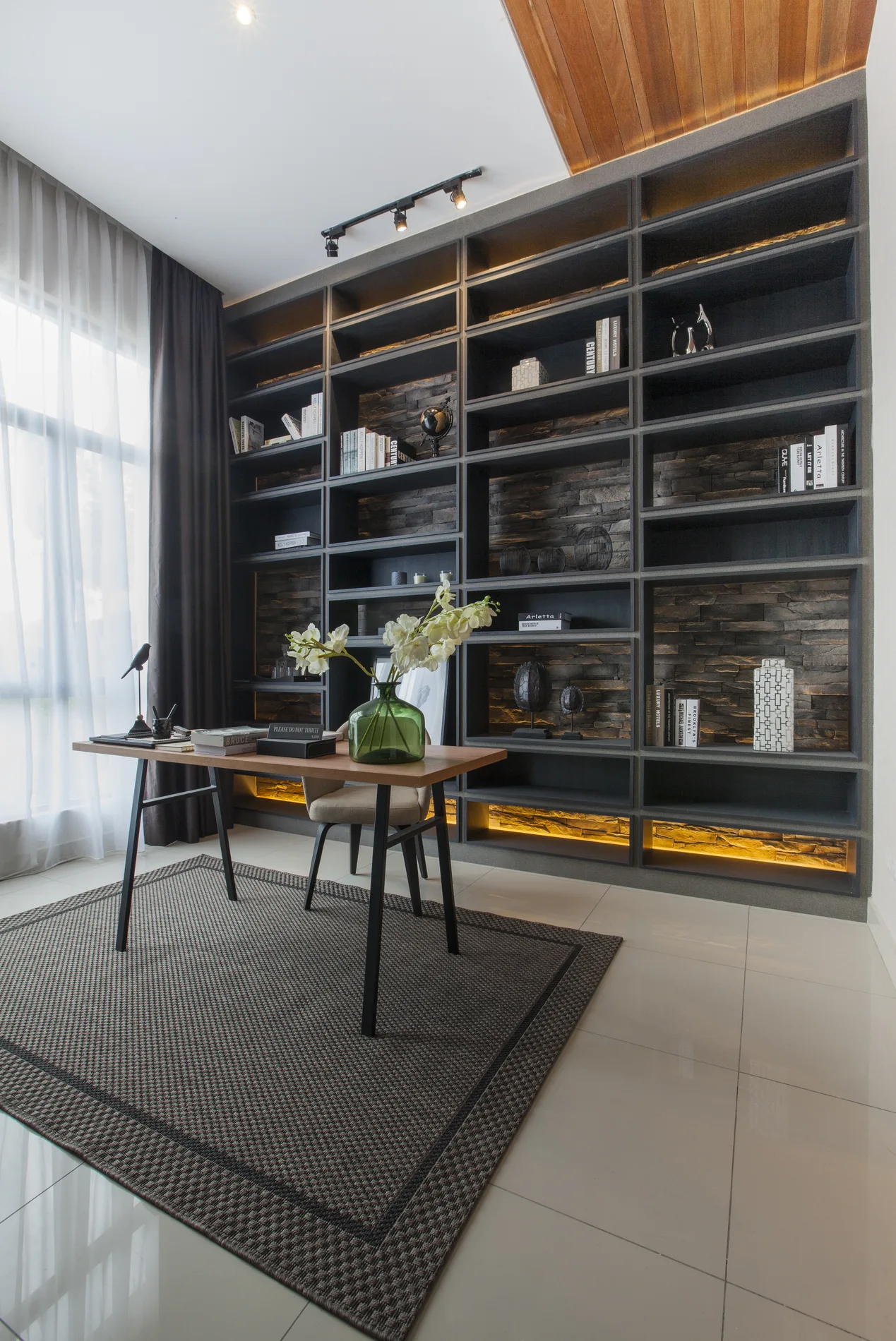 This triple-storey semi-detached home blends modern tropical design with natural materials and minimalist elements. The foyer features a high ceiling, L-shaped sofa, timber ceiling, and a wood-and-steel bar counter. The open-concept living and dining area is complemented by a shag rug and organic wall feature, while the dry kitchen boasts marble-like walls and Black Marquina marble counters.