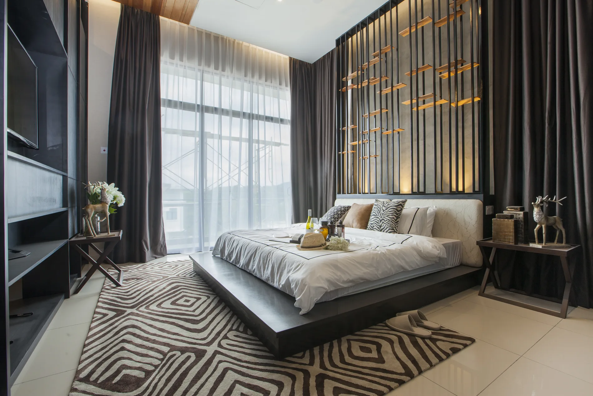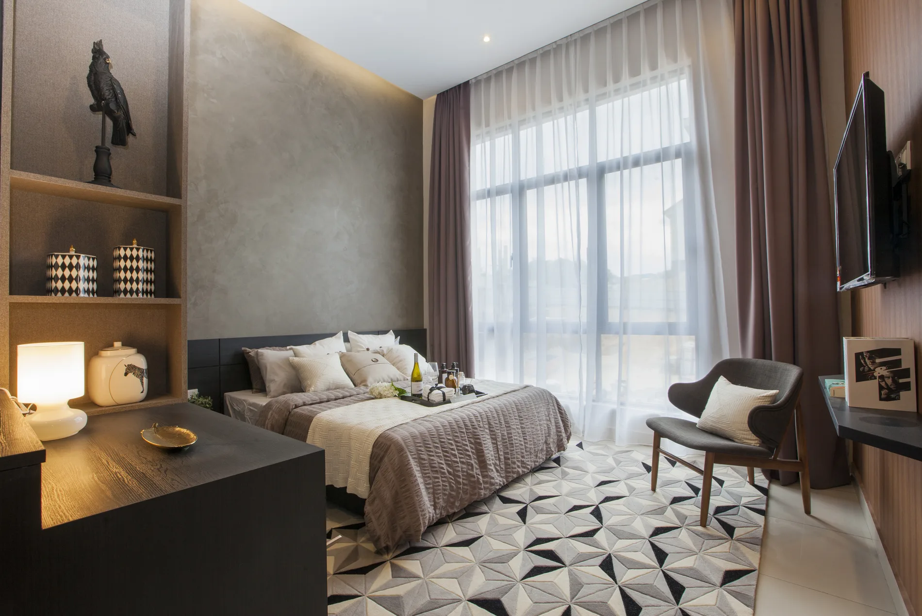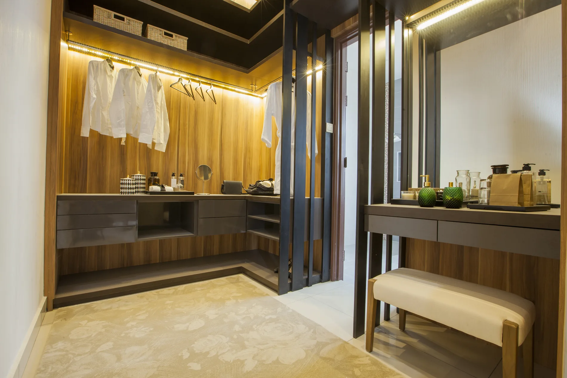 The master bedroom is divided into a bed chamber and study with folding Louvre panels, and the walk-in wardrobe has a mirrored ceiling. The other two bedrooms are designed with distinct styles: one with a modern monochromatic palette, the other with a functional walk-in wardrobe.